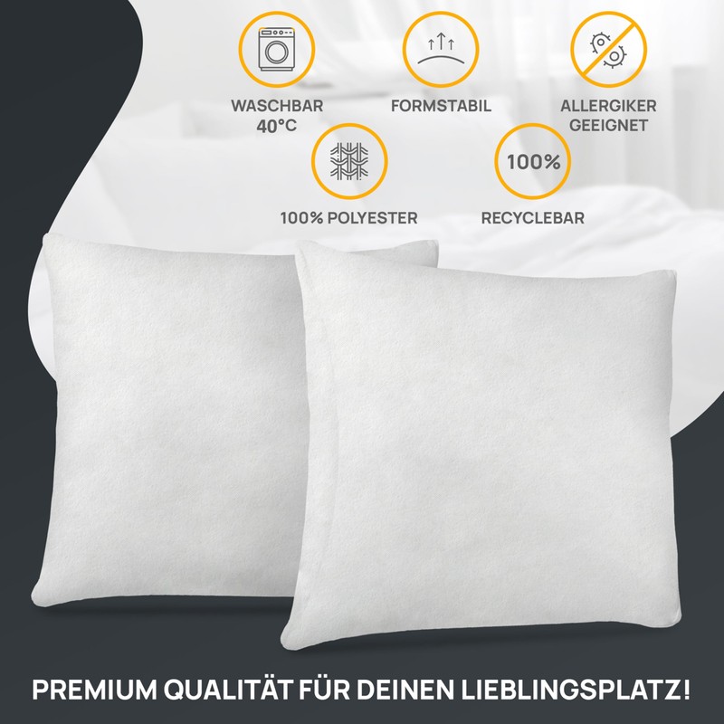 Beautifully soft, comfortable and plump filling for the perfect cushion. That is what our cushion fillings offer. The soft material made of 100% polyester is sturdy, moisture-repellent and easy to clean. Despite its light weight, the filling can withstand heavy loads, as the surface material is very tear-resistant and dimensionally stable. The filling gives your cushion covers a plump shape that invites you to relax. High-quality, made in Germany.