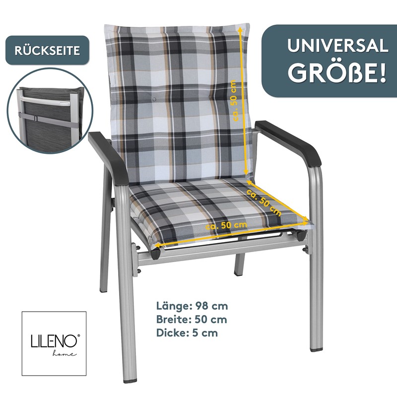 - 100% universal fit: Compatible with standard garden chairs, folding chairs or loungers: The Lileno Home chair cushions in different sets and colours for your garden furniture can be used for all garden chairs as a seat cushion. Depending on the design and thickness, you will find the right set here!