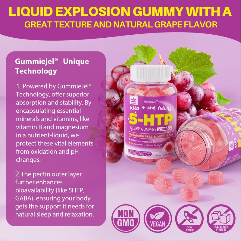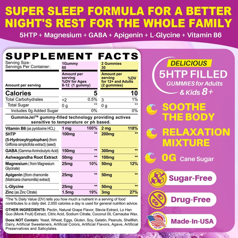 - Enhanced Absorption with Liquid Filled Gummies - Perfect 5HTP: A unique production technique mixes the ingredients with 5HTP, Magnesium and coconut oil infuses it into the filler to create the perfect gummy that's super absorbent, which delivers Ultra High Absorption when compared to ordinary 5HTP supplement. Sugar free slep gummies also contain GABA, Magnesium, B6, L-Glycine, Ashwagandha, Apigenin, providing a holistic approach to supporting overall health, great for adults and kids 8+!