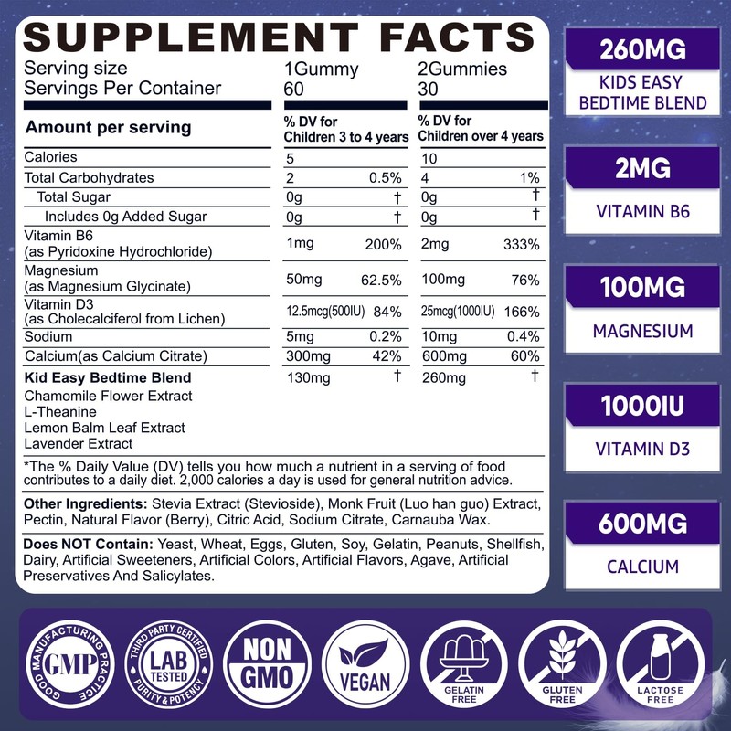 - Relaxation, Calm & Growth: Includes calming herbs such as Chamomile, Lemon Balm, and Lavender, along with Magnesium Glycinate and L-theanine, to promote relaxation, unwind and support restful sleep for kid. Combine with calcium & d3, these sleep gummies also help support healthy bone and overall kids natural development.