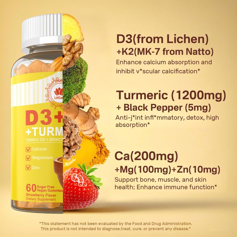 • Vitamin D3 boosts immunity and calcium uptake, while K2 directs calcium to bones. Turmeric fights detox, magnesium supports Alleviate fatigue, and zinc strengthens immunity. Black pepper ensures 2000% better absorption. Ideal for bones, teeth, and the immune system