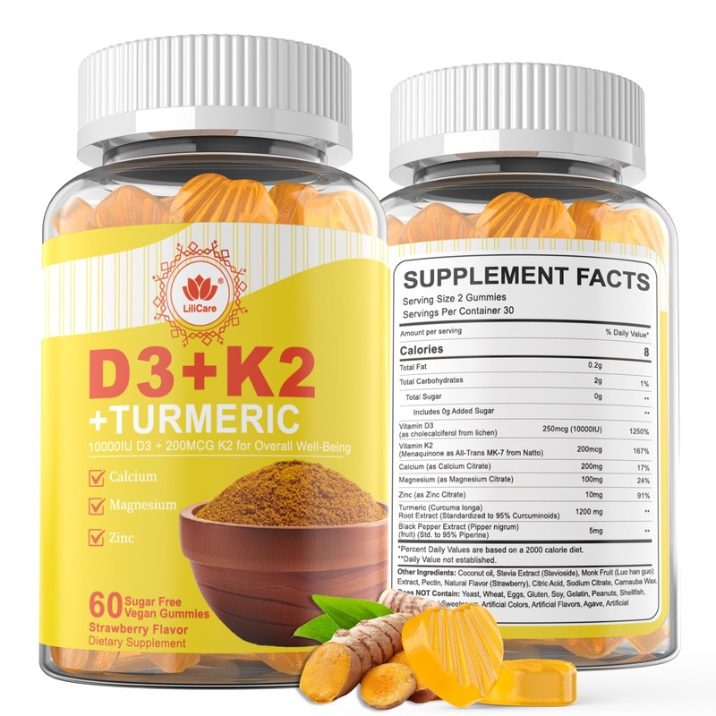 LiliCare Vegan Vitamin D3 10000IU & K2 (MK-7) 200mcg Gummies with Turmeric Extract 1200mg, Calcium, Magnesium, Zinc & Black Pepper (Piperine) – Supports Bone Health, Calcium Absorption & Immune System – 120 Count