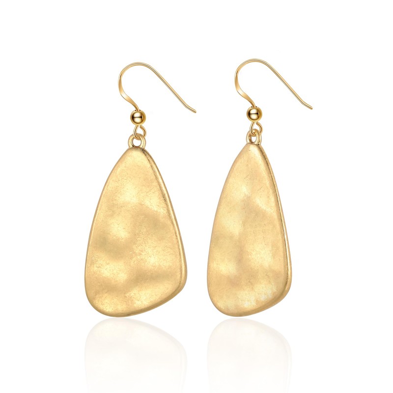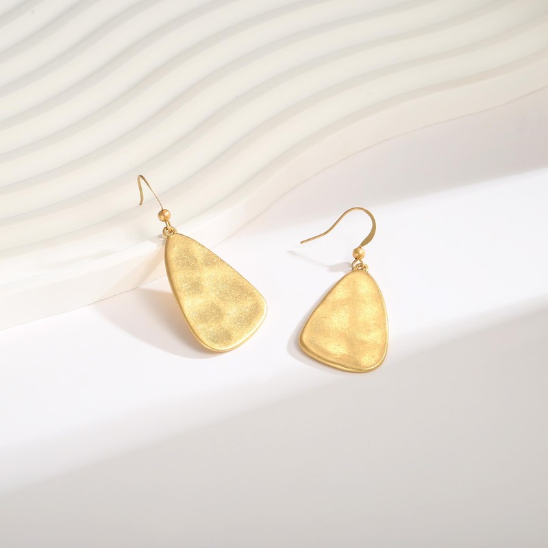 - These dangle earrings feature an antique gold finish with a distinctive triangle sheet shape, combining vintage charm with a contemporary edge for a truly unique and fashionable accessory.
