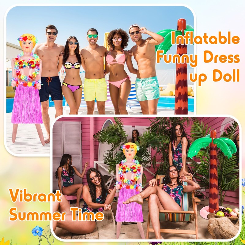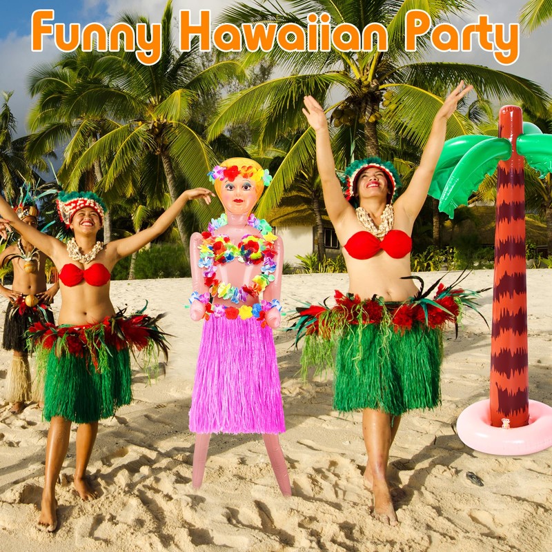 - Considerate Set for Hours of Fun: experience the ultimate beach party, right at your home with our inflatable funny dress up doll set; It includes a no moving parts Judy doll, a tropical inflatable palm tree, and a beautiful Hawaiian hula grass skirt with flower costume set; The package also makes room for 2 hand garlands, 1 head garland, 1 halterneck wreath, and 1 bikini floral bra; Delight your party guests in a fun filled atmosphere whatever the occasion is