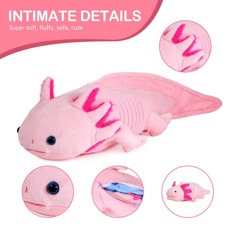 - Size Introduction: Soft lovely axolotl stuffed animal plushies sets. It is composed of three form, Comes with axolotl mommy and 2 mini axolotl babies. This children's plush set includes 21” plush tummy-zippered axolotl carrier with 2 small axolotl. The axolotl plush toy baby size is 20×7×9cm, and The axolotl plush toy mom size is 55×23×14cm(Length×width×height).