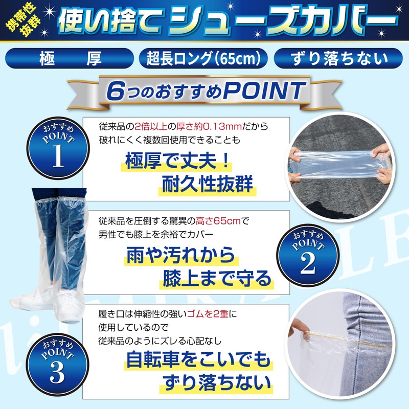 - [Performance] With an extra thickness of 0.005 inch (0.13 mm) that is more than twice as thick as conventional products, it is resistant to tearing, and can be used multiple times. There are 2 types of height to choose from depending on the height and application. The long type that covers over the knee with extra room is 25.6 inches (65 cm) and the middle type is 17.7 inches (45 cm) below the knee, so you can wear your favorite shoes and pants without having to worry about rainy days. The rubber opening is double layered, so it does not slip off even if you are riding a bicycle, so it is compatible with your bike clippers. Your pants will stay dry and comfortable when you go to the office or school. The bottom uses a rugged embossing, making it more slippery than conventional products. When you're done using it, simply throw it in the trash can. Please do not use in manholes, slippery roads, frozen places, snow areas, and oil areas. Due to the nature of the material, water may seep through the bottom of the product due to damage caused by friction on the road and shoes