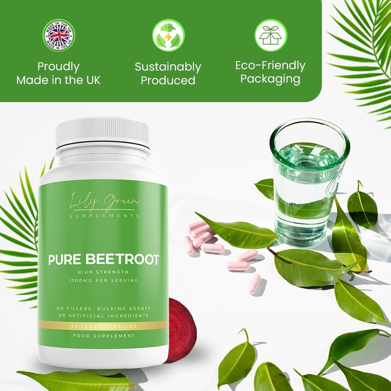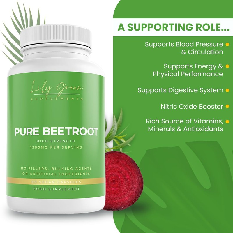 - Lily Green Pure Beetroot Capsules: Experience the benefits of our high-strength Pure Beetroot Supplement, delivering 1300mg of pure beetroot per serving in each of the 90 vegan capsules. Rich in vitamins, minerals, and nitrates, these capsules are designed to boost nitric oxide levels and support your overall health.