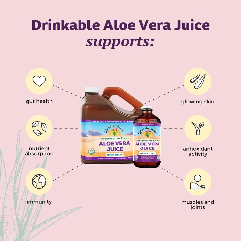 - REAP THE BENEFITS OF ALOE JUICE: Aloe vera, organically grown on Lily of the Desert’s own fields, yields a soothing and beneficial juice that helps you feel good from within, every day.