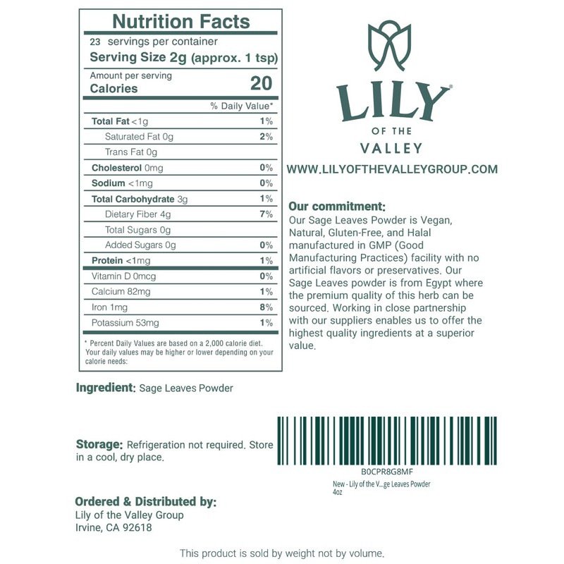 Lily of the Valley Sage Leaf Powder - Ground Dried Sage leaves - Seasoning Herb Spice - No Fillers & No Additives - Great for Cooking - Vegan & Gluten-Free - Packed in Resealable Pouch (8oz, 226g)