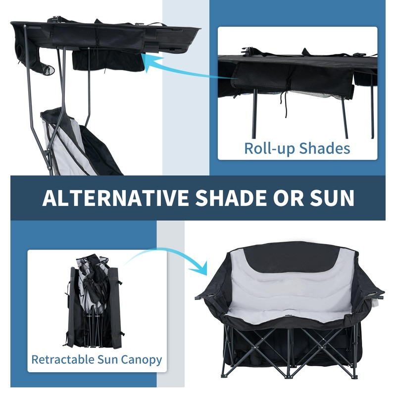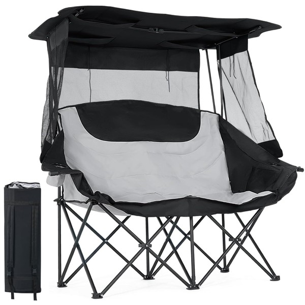 LILYPELLE Double Beach Chair with Canopy Shade, Oversized Folding Camping Chair with Canopy Loveseat Camp Chair with Cup Holder, Side Pocket for Camp, Beach, Lawn, Fishing