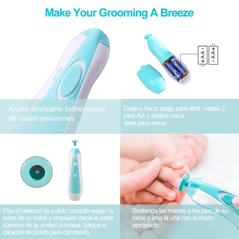 - ❤ 【Seguro y confiable】 La lima de uñas eléctrica para bebés es muy suave con las uñas del bebé y puede envolverlas de manera segura en segundos sin dañar la cutícula o el lecho ungueal suave. Se ralentiza o se detiene cuando entra en contacto con la piel del bebé y es completamente seguro. Requiere 2 pilas AA para la alimentación, las pilas no están incluidas en el paquete.