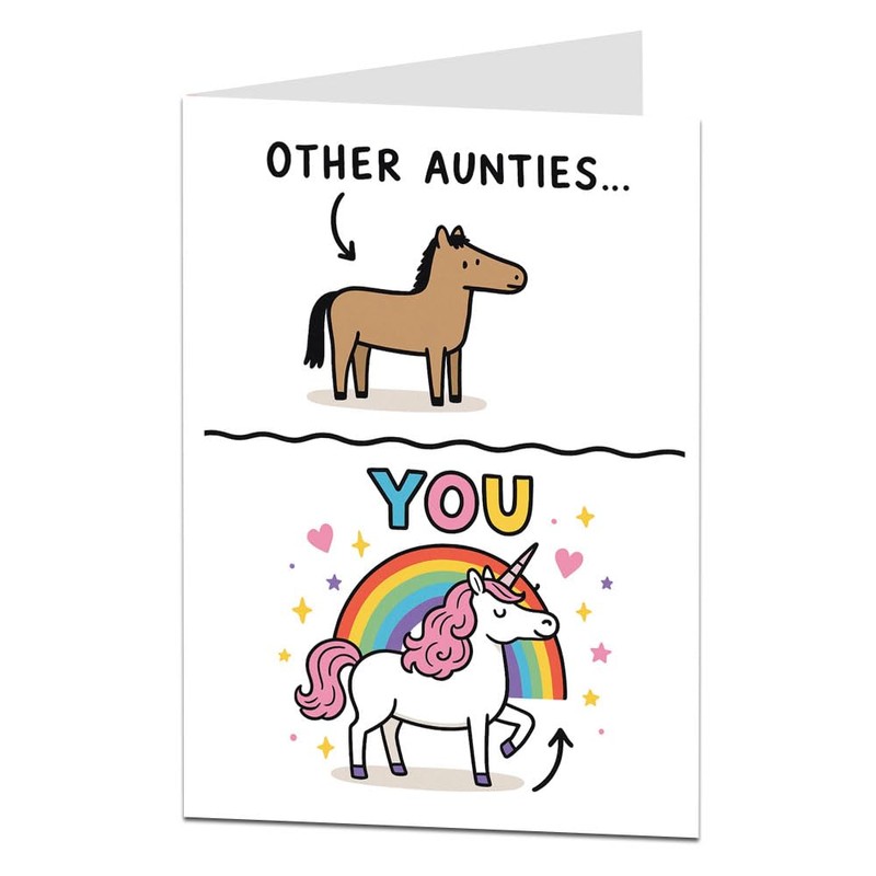 - đ HILARIOUS DESIGN SHE'LL LOVE â Searching for an auntie birthday card funny enough to make her laugh out loud? Look no further! This cute unicorn card is ideal if you're after aunty birthday cards that are a little different, full of charm, and totally unforgettable. A winner for sisters, nieces or nephews to give! đđ