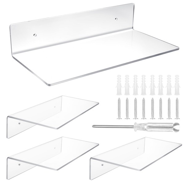 Limbeuuu 4 Pack 12 Inch L-Shaped Acrylic Floating Shelf Clear Wall Mounted Shelves Invisible 4.3MM Thick Shelf for Wall Storage Clear Shelves for Makeup Photo Picture Book Record Display