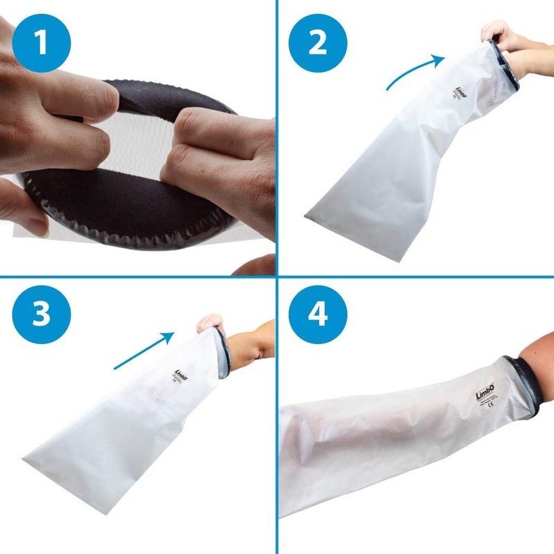 The LimbO arm cover is a comfortable, easy-to-use, reusable waterproof protector. It has a flexible, self supporting seal which prevents the penetration of water to wound dressings, bandages and casts on arms during showering and bathing. The LimbO arm cover provides a significant quality of life improvement for the user. It is a non-sterile product and is primarily intended for use in the shower and bath .