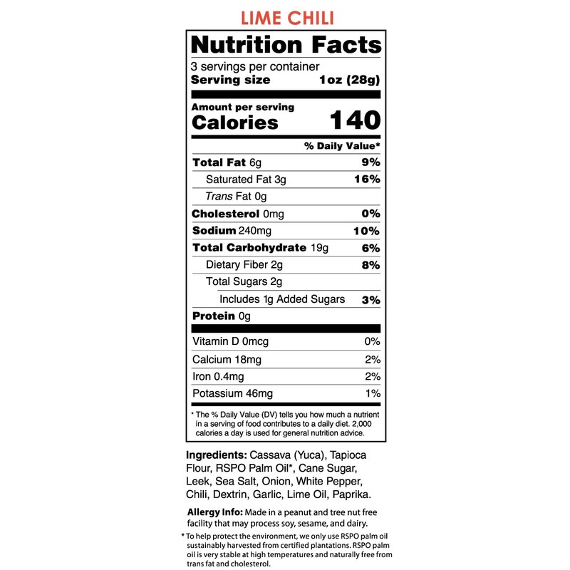 - Ingredients: Cassava (Yuca Chips), Tapioca Flour, Palm Olein Oil, Cane Sugar, Leek, Sea Salt, Onion, White Pepper, Chili, Dextrin, Garlic, Malic Acid, Lime Oil, Paprika.