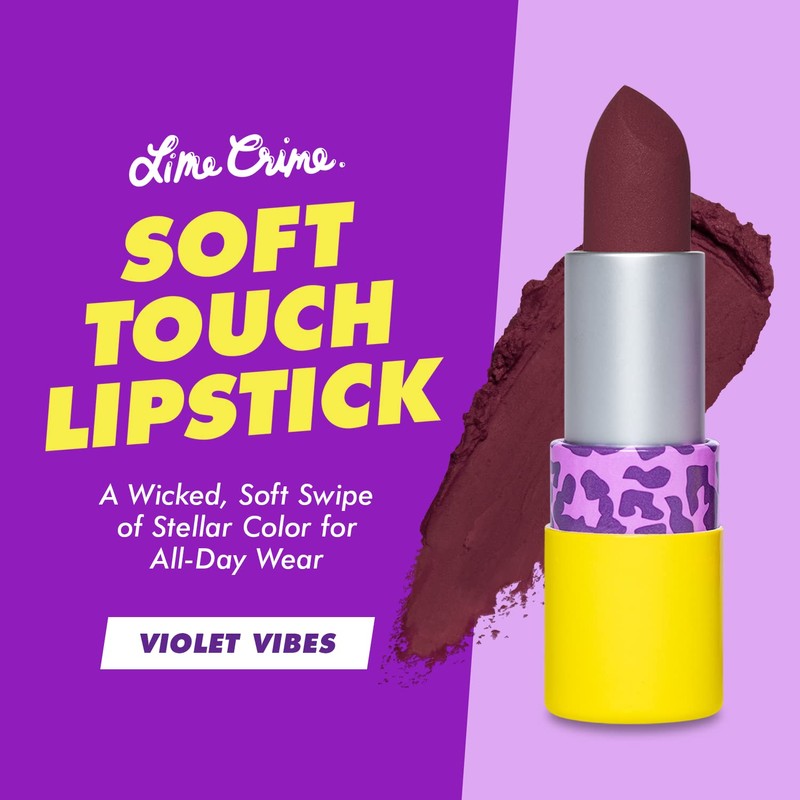 - Violet Vibes Soft Touch Lipstick: Look no further, Lime Crime’s Soft Touch Lipstick is the smoothest, most comfortable and wearable matte lipstick you’ll ever try on. Violet Vibes delivers a cloud of deep violet to the lips, effortlessly gliding on to smooth out lip lines with a lip blurring effect.