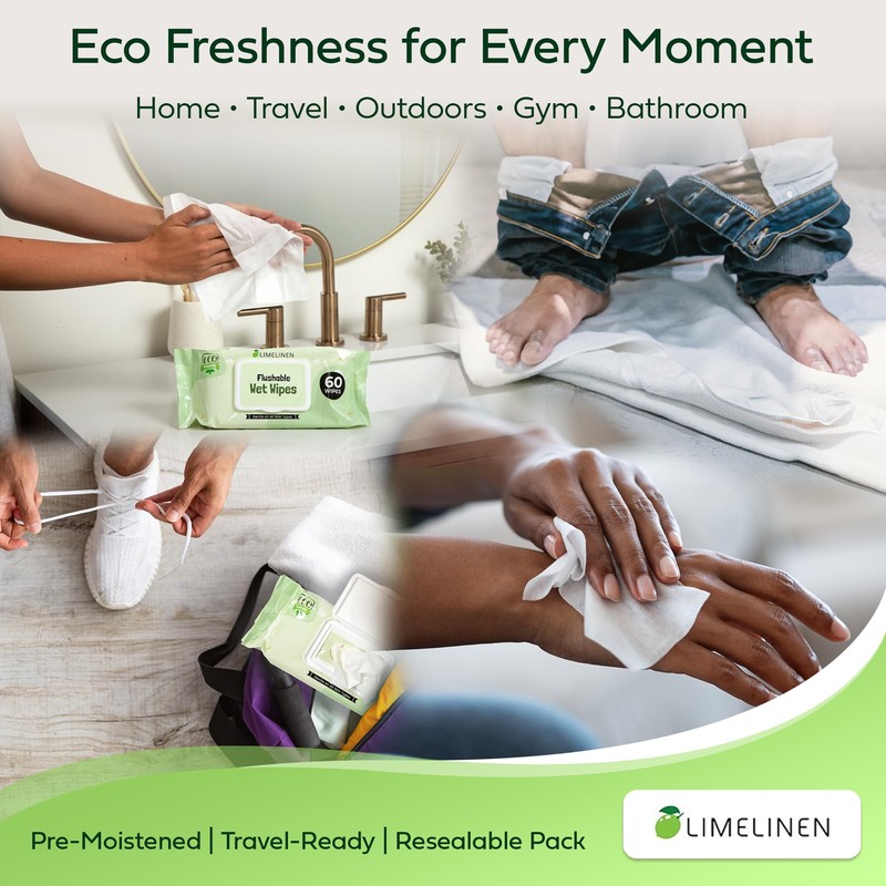 LimeLinen Flushable Wipes 100% Plant-Based, Alcohol-Free, Hypoallergenic, pH-Balanced | Flushable & Septic-Safe, Resealable 60-Count Value Pack (1-Pack 60 Wipes)