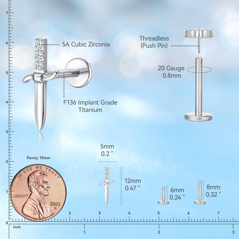 - Post Thickness: 20 gauge = 0.8mm; Post Lengths: 6mm and 8mm. Each pack includes one stud top, one 6mm post, and one 8mm post. Crafted from ASTM F136 titanium, with AAAAA-grade cubic zirconia gemstones. Ideal for various piercings including nose,cartilage, helix, conch, tragus, lobe, rook, daith.