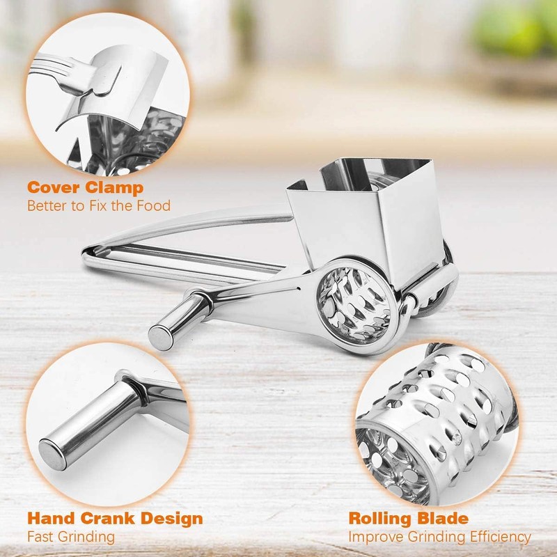 - 🍅【 Materiales De Alta Calidad】Rallador giratorio hecho de acero inoxidable de grado alimenticio de alta calidad, el rallador de queso en bloque es seguro y respetuoso con el medio ambiente, resistente y duradero, y más seguro de usar. Fuerte practicidad y rendimiento de alto costo. La trituradora de queso es adecuada para moler quesos, pepinos, calabazas, ajo e incluso nueces.