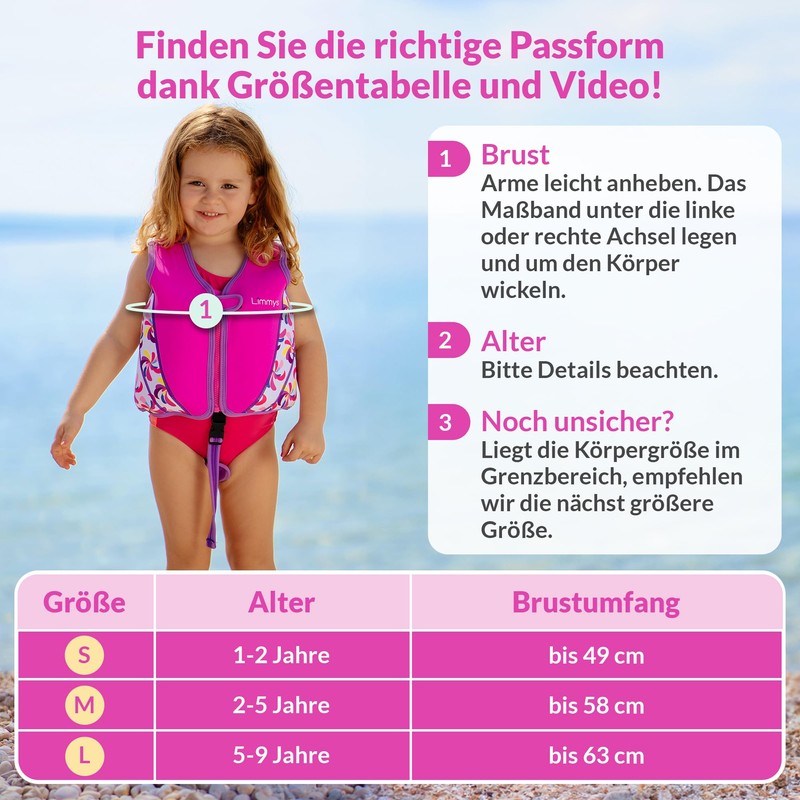 - IMPROVE YOUR CHILD'S SWIMMING EXPERIENCE: Made from high-quality neoprene, the vest offers unparalleled durability and a comfortable fit. The adjustable seat belt ensures a secure fit and the Velcro fastener on the zipper protects your child's skin. Our innovative system with removable floats ensures perfect buoyancy. Check out our size chart to find the right size, e.g. 1-2 years. Measure your chest circumference to be sure.
