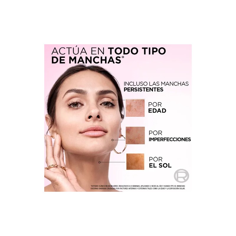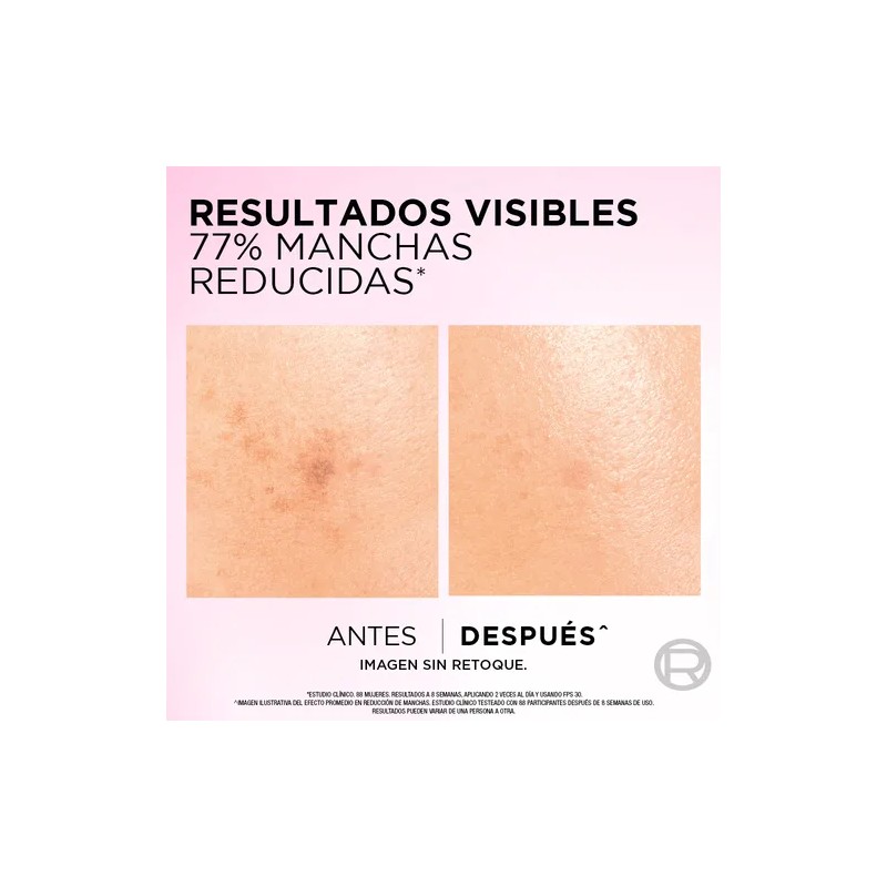 - Reduce un 77% las manchas. Actúa en todo tipo de manchas: solares, por edad, por imperfecciones e incluso en las manchas persistentes