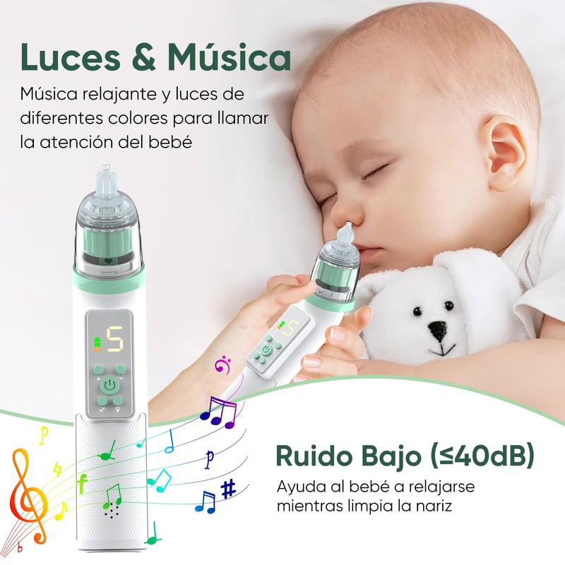 - ✔️【Luz y Música Calmantes】Este aspirador nasal electricopara bebe está diseñado con luces calmantes y música suave que puede atraer la atención del bebé. Deje a su hijo más relajado y concentrado mientras limpia la nariz. El bajo nivel de ruido durante el trabajo (menos de 40 db) crea un ambiente tranquilo para los niños y reduce su ansiedad.
