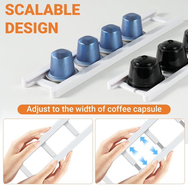- Easy Assembly & Adjustable Width: Designed for simple DIY setup, each holder features a retractable frame that’s easy to assemble and adjust. Modify the width to match your pods, then arrange the 4 sections in configurations (e.g., 2 on a cabinet door, 2 on a wall) to fit your kitchen layout