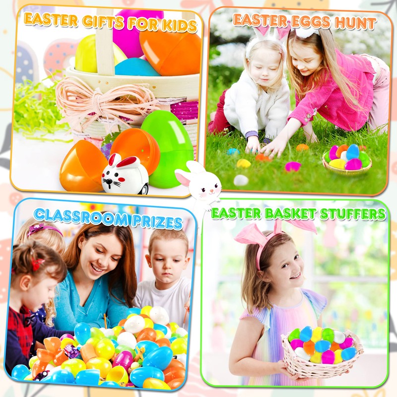 - COLORFUL EASTER EGGS - Prefilled Easter eggs pack contains different colors and can be used as a special gift for kids. Colorful Easter eggs can attract more attention of children in Easter egg hunting! Each Easter egg size is 2.4 inches. Compact and Durable, these Easter eggs snap together nicely and can be reused for years