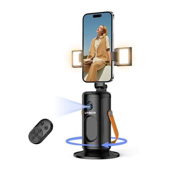 Linber P08 Auto Face Tracking Phone Holder, No APP, 360°Rotation Phone Tracking Gimbal with Detachable Remote & 2 Fill Light, Phone Stand Gesture Control for Vlogging, Live Streaming, Video Recording