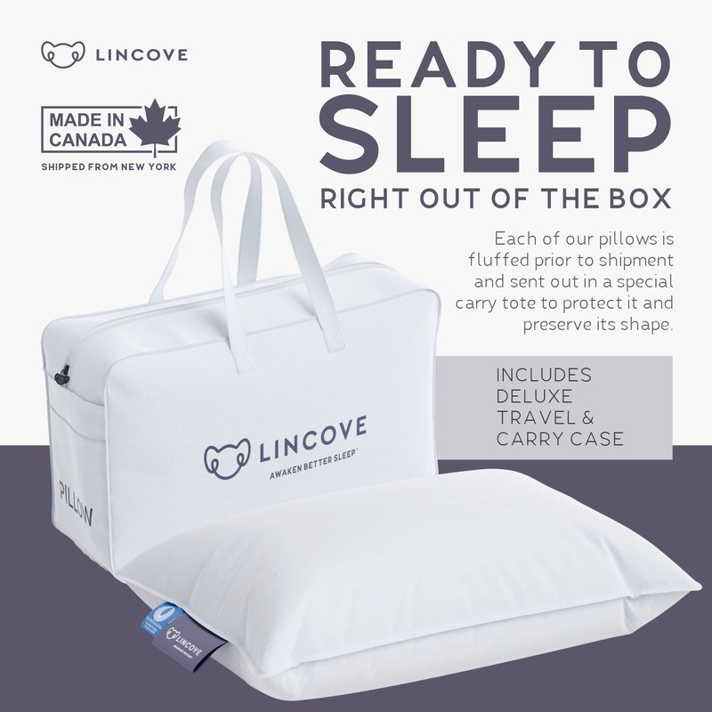 - READY TO SLEEP - Your new Lincove travel pillow comes ready to use in our luxury gift travel tote bag. If you pack it in your bag or luggage it fluffs up in just seconds for instant comfort and travel convenience while on vacation, camping, traveling, or staying in hotels.