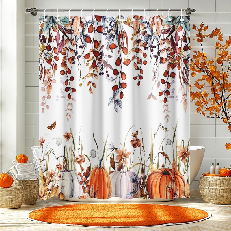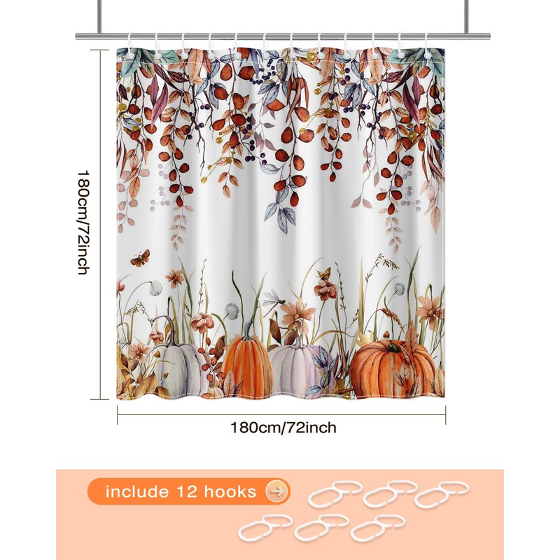 Lindameler Watercolor Autumn Leaves Shower Curtain Botanical Pumpkin Bathroom Curtain Fall Thanksgiving Waterproof Fabric Bath Shower Curtain Set with 12 Hooks 72 x 72 INES (Fall 1)