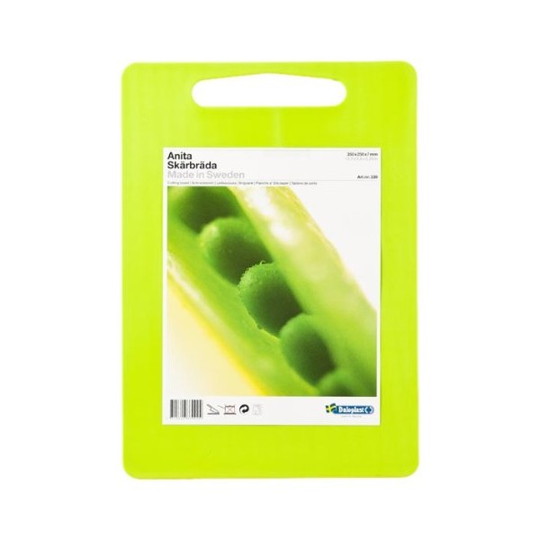 Perfect for the kitchen prep area, this Linden Sweden-Daloplast Anita cutting board features a durable polythene construction and measures 13-1/4 by 9-3/4-inch, great for those larger prep jobs. Made in Sweden, this board has a handle cutout at the top for easy transport, or for hanging up at arm's reach. This cool cutting board won't dull your knives, and is dishwasher safe. Comes in a variety of colors.
