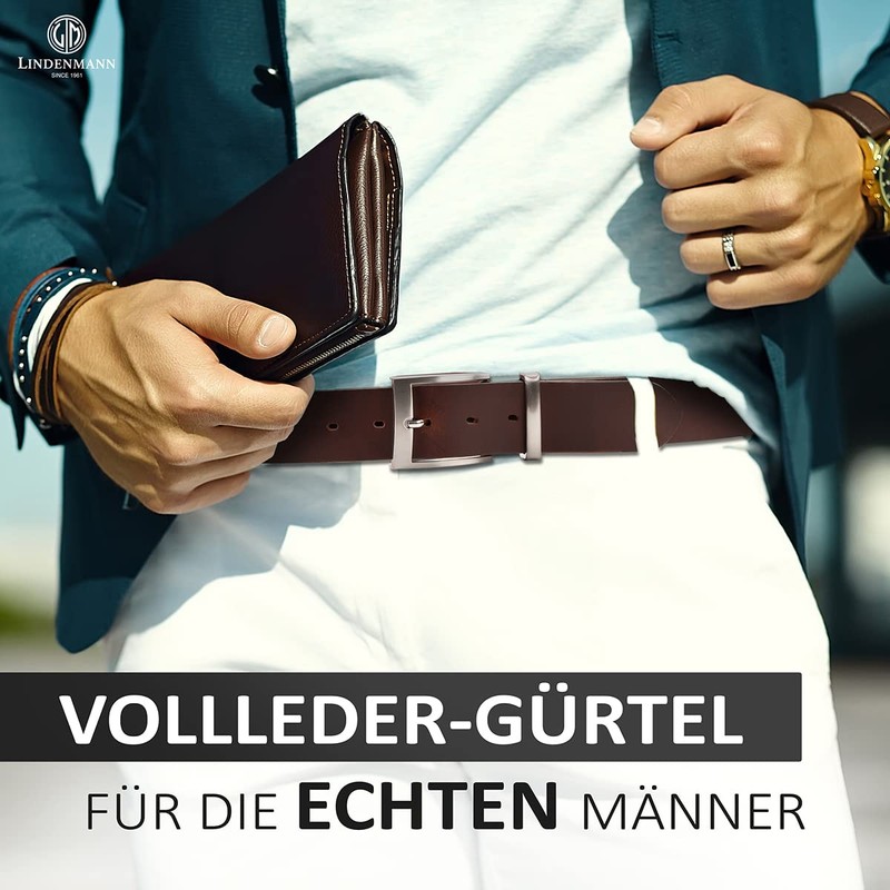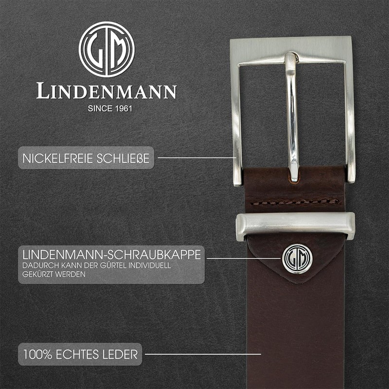 - Quality and information obligations regarding GPSR: manufacturer and person responsible for EU Lindenmann GmbH & Co. KG, Lochäckerstr. 13, 75177 Pforzheim, www.lindenmann.com, men's leather belt, dark brown, made from 100% full leather belt