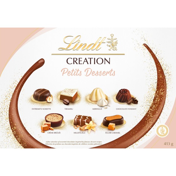 Chocolate pralines inspired by classic dessert recipes. Now featuring new and updated recipes from the Lindt Master Chocolatiers-fondant chocolate, caramel eclair, meringue, creme brulee, chocolate brownie, millefeuille and tiramisu.