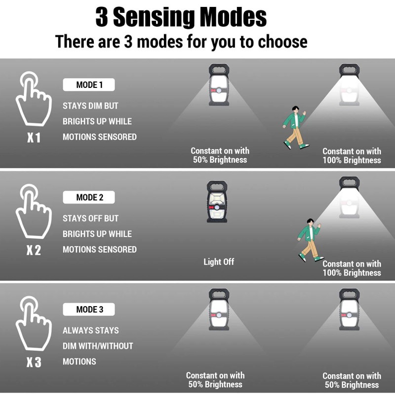 Mode 1: human body sensing + low light mode (the light is 100% bright when people pass by, and the light turns to low light 20 seconds after people turn on)