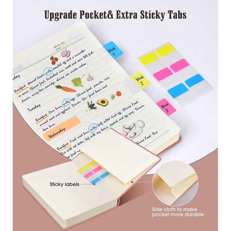 - 【Upgrade Lined Journal Notebook】Comes with 1 elastic closure band & 1 elastic bookmark band, more stable. An expandable inner storage pocket to keep track of appointment cards,notes,receipts,and more. 1 gift of multicolor index tabs stickers for papers classifying and marking.