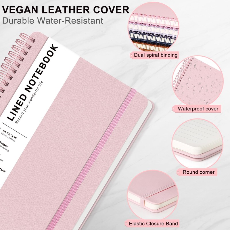 Lined Spiral Journal Notebook, A4 Hardcover Leather Notebook for Work, 8.5''×11'', 100GSM Thick Paper Spiral Bound Journaling Notebooks for Women & Men Office School Note Taking Business, Pink