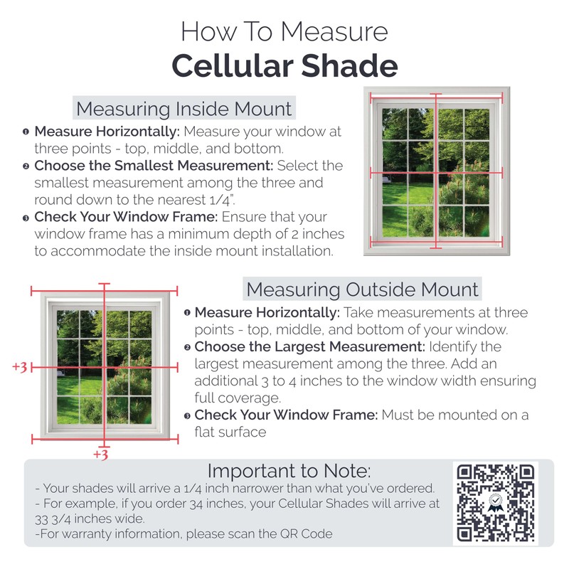 - | HOW TO ORDER | Measure the width and height in three places. Round down to the nearest 1/4th inch available. To ensure mobility within the window frame and space for the mounting brackets, our team will deduct 1/4th of an inch from the width ordered. (For example, if you order 34 inches, your blinds will arrive exactly 33 3/4th inches wide). For an outside mount, we recommend adding 3 to 4 inches to the width and height when ordering.