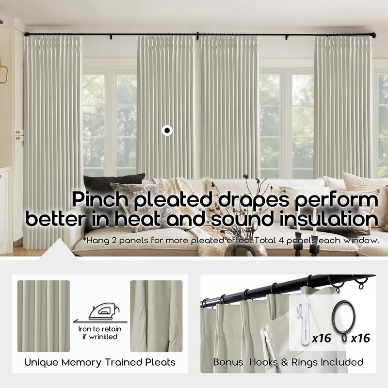 - Memory Shape Pleats & Iron Needed for Better Pleats: SHINELAND pinch pleated curtains feature memory shaped craftsmanship unlike other brands hanging ugly.Drape just like a custom made window treatments designed by big budget designer.Hang 4 panels for designer level pleated effect. PLEASE NOTE: Ironing still recommended to remove wrinkle from package or in case drapes not kept by last customer.