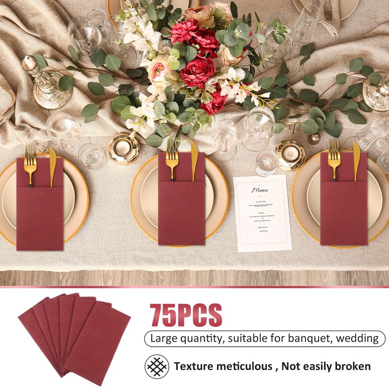 Linen Feel Napkins, Disposable Airlaid Paper Napkins Prefolded Dinner Napkins with Built in Flatware Pocket for Silverware Valentine Wedding Party Christmas Day (Burgundy,150 Pieces)