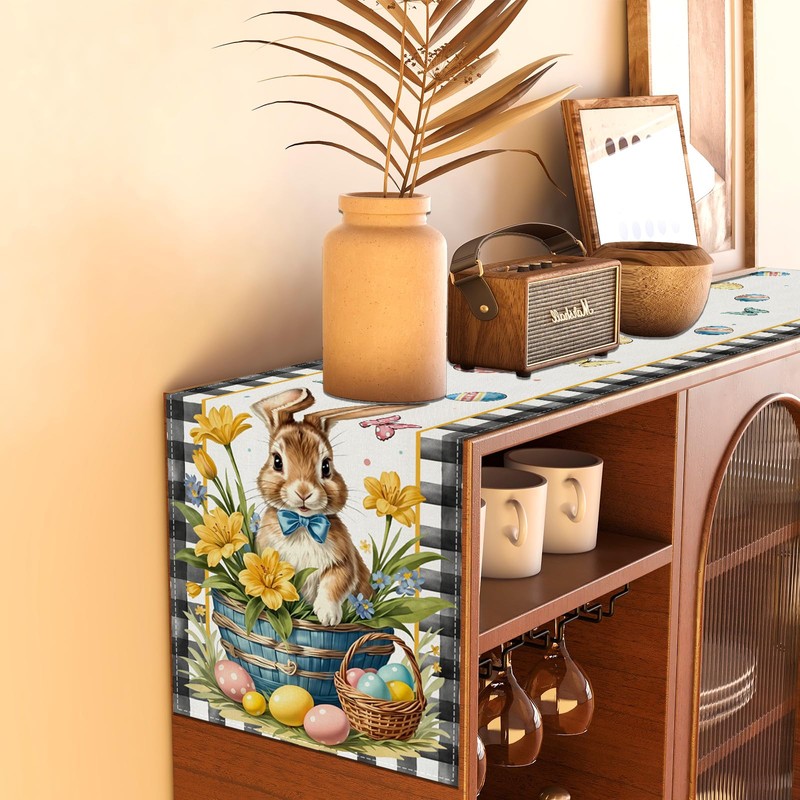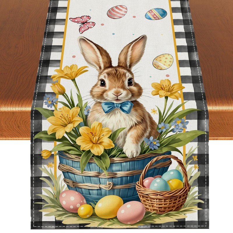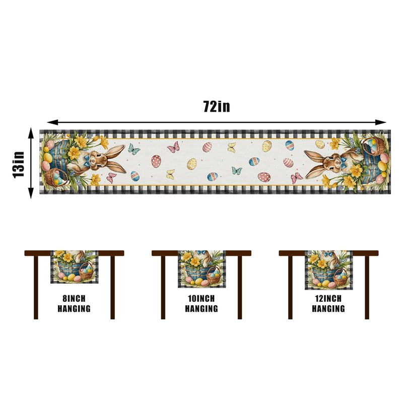 Linen Happy Easter Table Runner Bunny Rabbit Easter Eggs Flower Tablecloth Easter Spring Summer Party Decorations and Supplies for Home Kitchen Table-13×72''