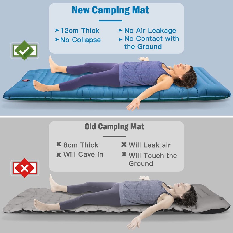- ⛺【12CM/4.7INCH Enhanced Camping Mat】This enhanced inflatable camping mattress is equipped with built-in ergonomic mini airbags, providing you with complete insulation from the cold ground and hard rocks. It ensures that your body won’t sink into the cold ground, offering maximum comfort and warmth for a good night’s sleep. You’ll never have to worry about feeling the damp ground or hard stones when traveling or camping. The surface bumps of the inflatable mattress have been minimized, allowing you to sleep comfortably on your back or side.