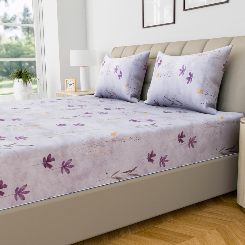 LINENWALAS 100% Cotton Percale King Size Fitted Sheet Only, Printed All Around Elastic Deep Pocket up to 40 cm Premimum Bottom Fitted Bed Sheet 150x190 CM (King, Haze of Lavender)