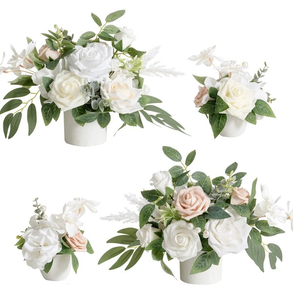 Ling's Moment White & Sage Artificial Flowers with Vase Wedding Decor Centerpiece Flower Potted for Ceremony Reception Tabletop Desk Flowers Mantel Archway Aisle, Fake Flowers Set of 4