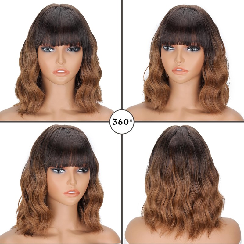 - [High Quality Material]--Short brown and light brown wigs with bangs, this ombre brown wig with bangs for women uses high quality high temperature resistant synthetic fibers, the craftsmanship is improved, The brown wavy bob wig looks real, flowy and bouncy, have beautiful, long, thick, realistic looking hair and hairline, If you need a luxurious hair style in a minute, this short pink wigs for women is your best choice.