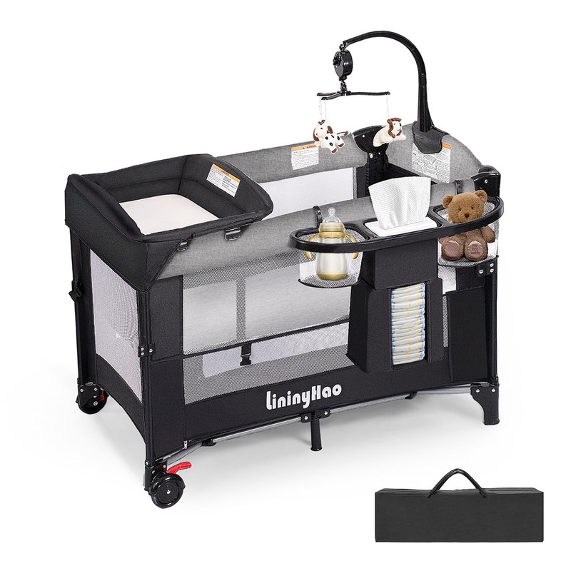 LININYHAO 3 in 1 Height Adjustable Baby Playard, Foldable Nursery Center with Music Box Toy Rack, Side Storage, Changing Table, Large Portable Playpen for Newborns and Toddlers(Gray)