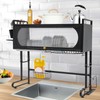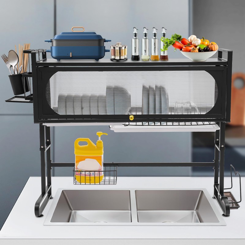 LINISHOP Sink Dish Drying Rack Large Dish Rack Free Standing Dish Drainer Kitchen Organizer Carbon Steel Storage Shelf Holder 3 Adjustable Height w/Clear Cabinet Door, 34.25in (Black)