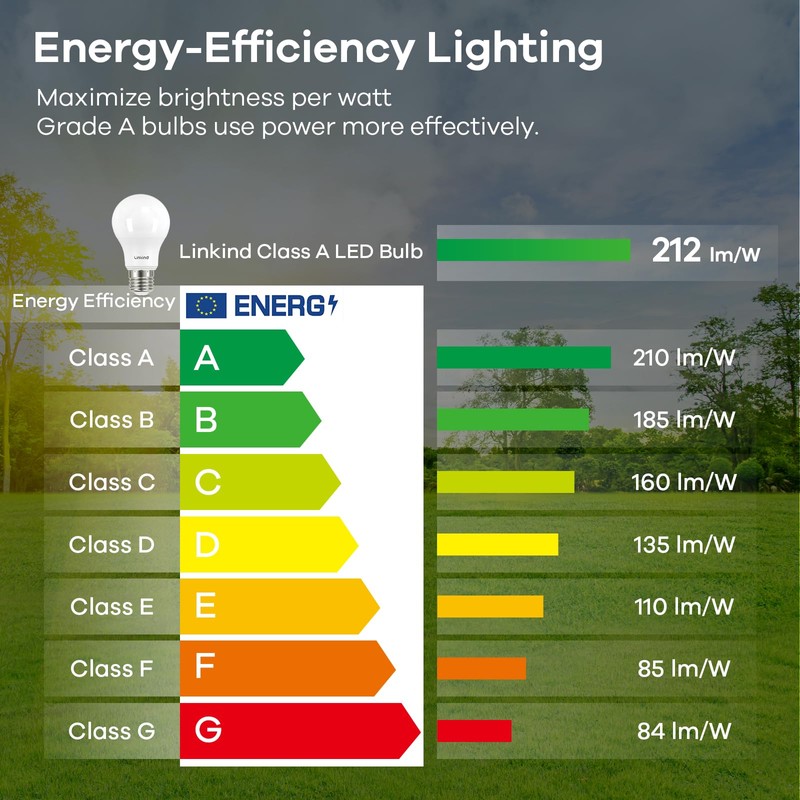 • Higher brightness and lower energy consumption: compared to conventional incandescent bulbs of class E/F (100lm/w), the Linkind class A bulb offers double brightness (211lm/w) with the same power consumption. 3.8 W A-label LED bulb replaces 60 W conventional lamp, saves over 93% of energy