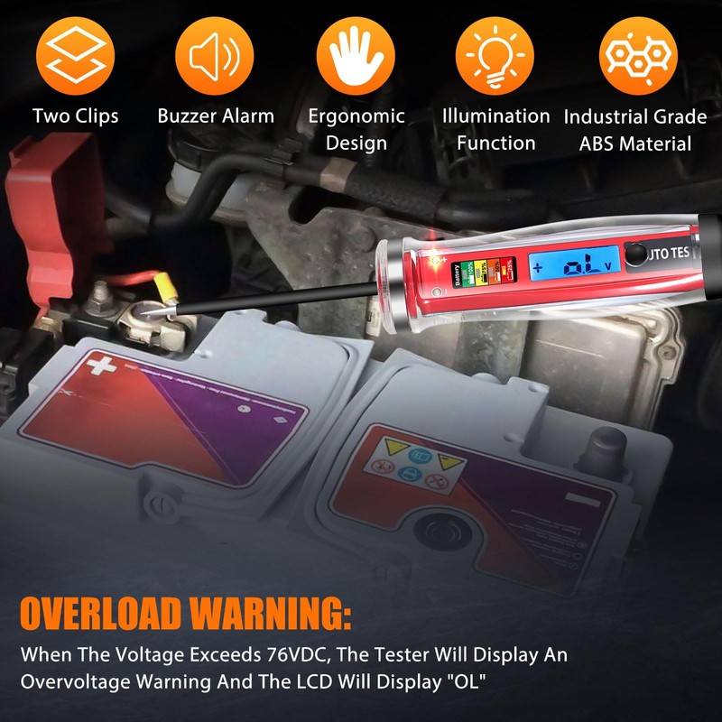 - Multifunctional LCD Display: The upgraded test light comes with a high-definition backlit LCD display, offering 0.1V resolution for precise voltage readings. A built-in light under the handle provides visibility in low-light conditions, and an overvoltage warning appears when voltage exceeds 76VDC, displaying "OL" on the screen