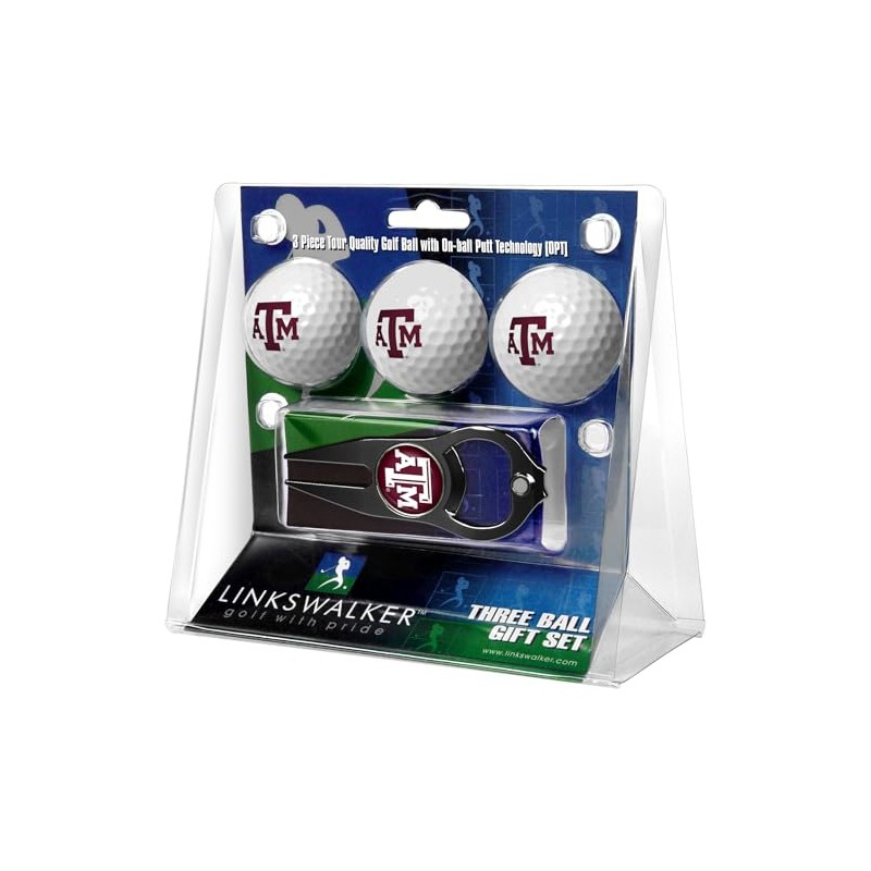 LinksWalker Texas A&M Aggies - 3 Golf Ball Gift Pack with Hat Trick Divot Repair Tool Black